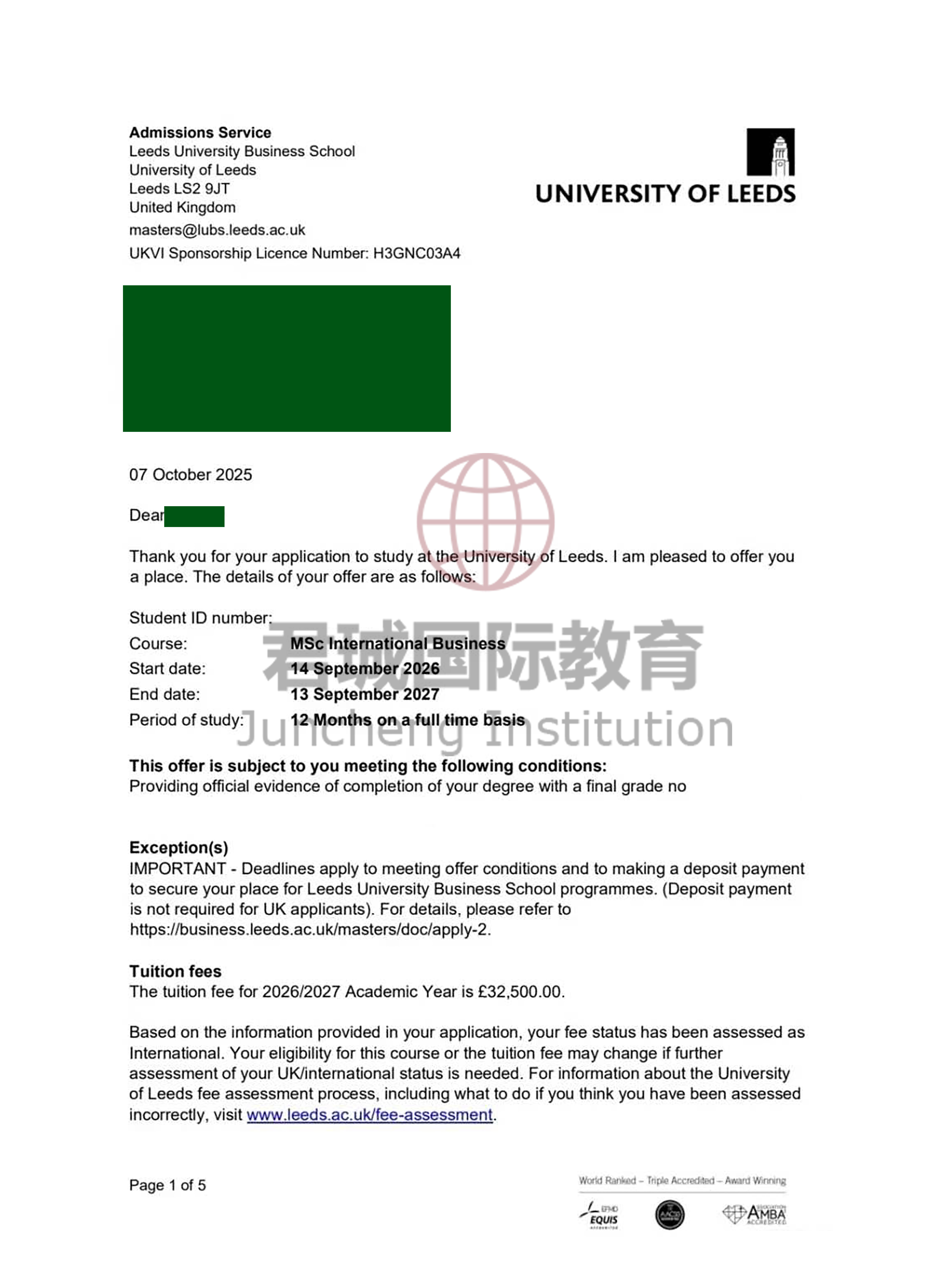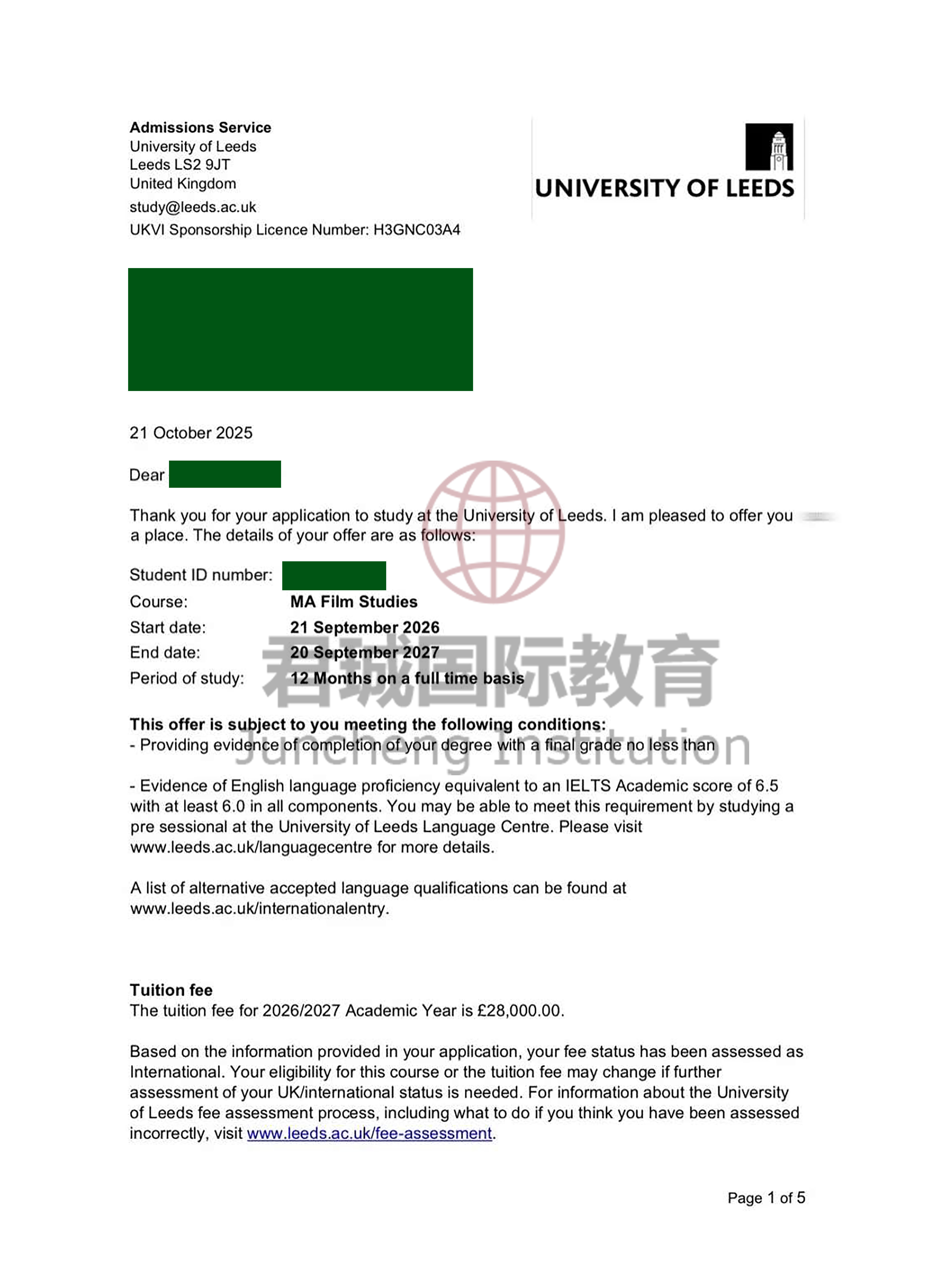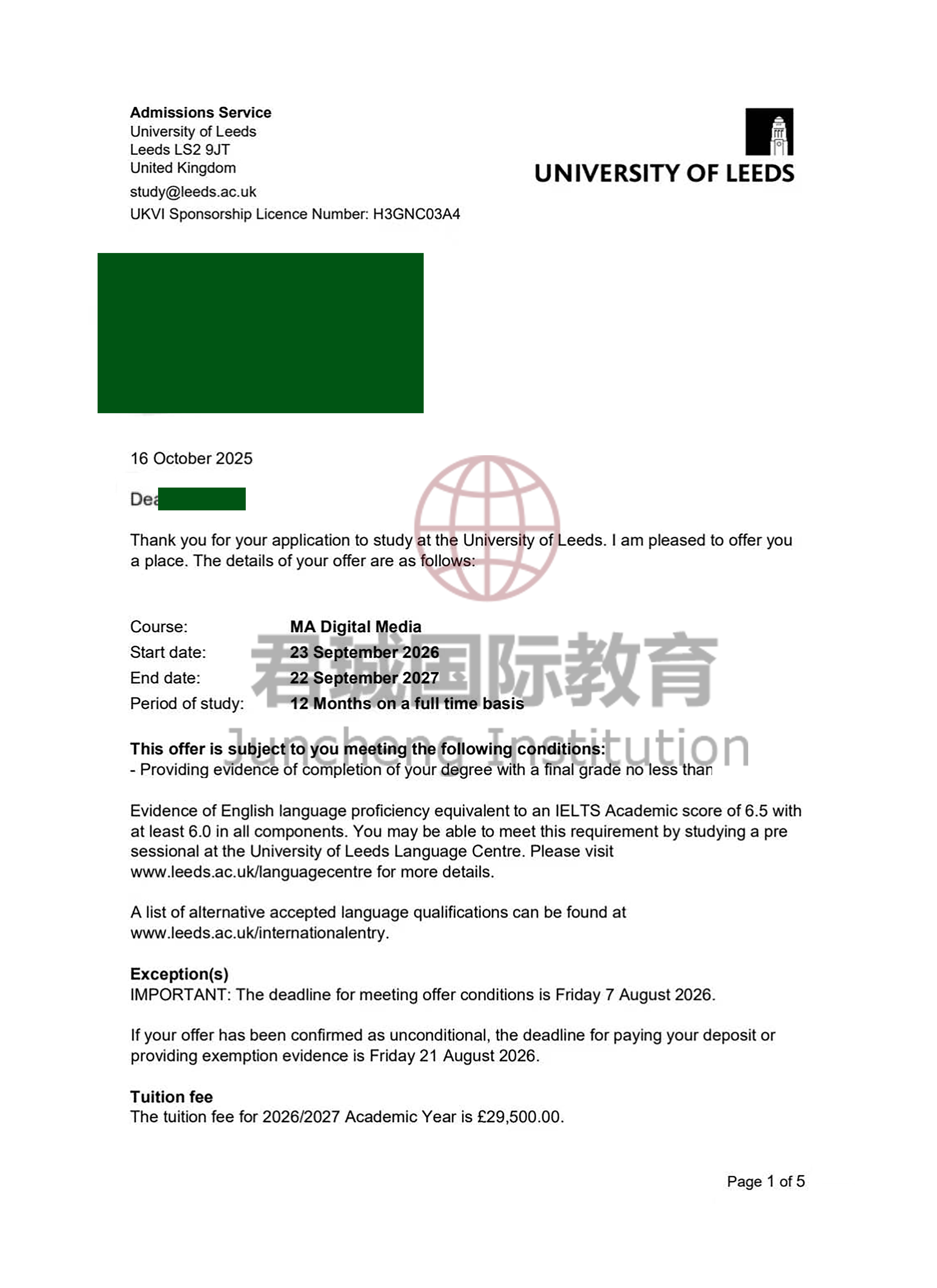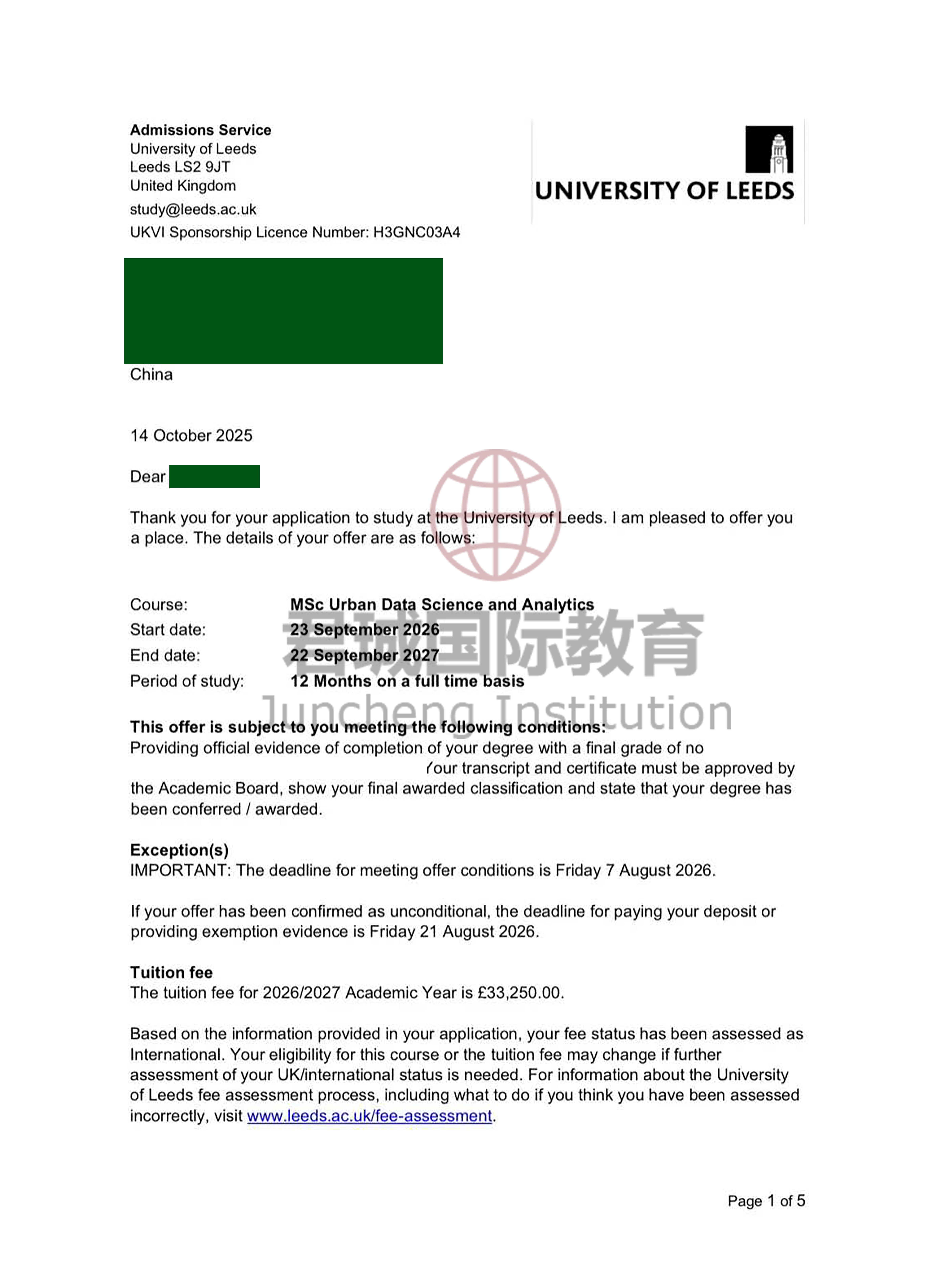 录取Offer:英国利兹大学 University of Leeds