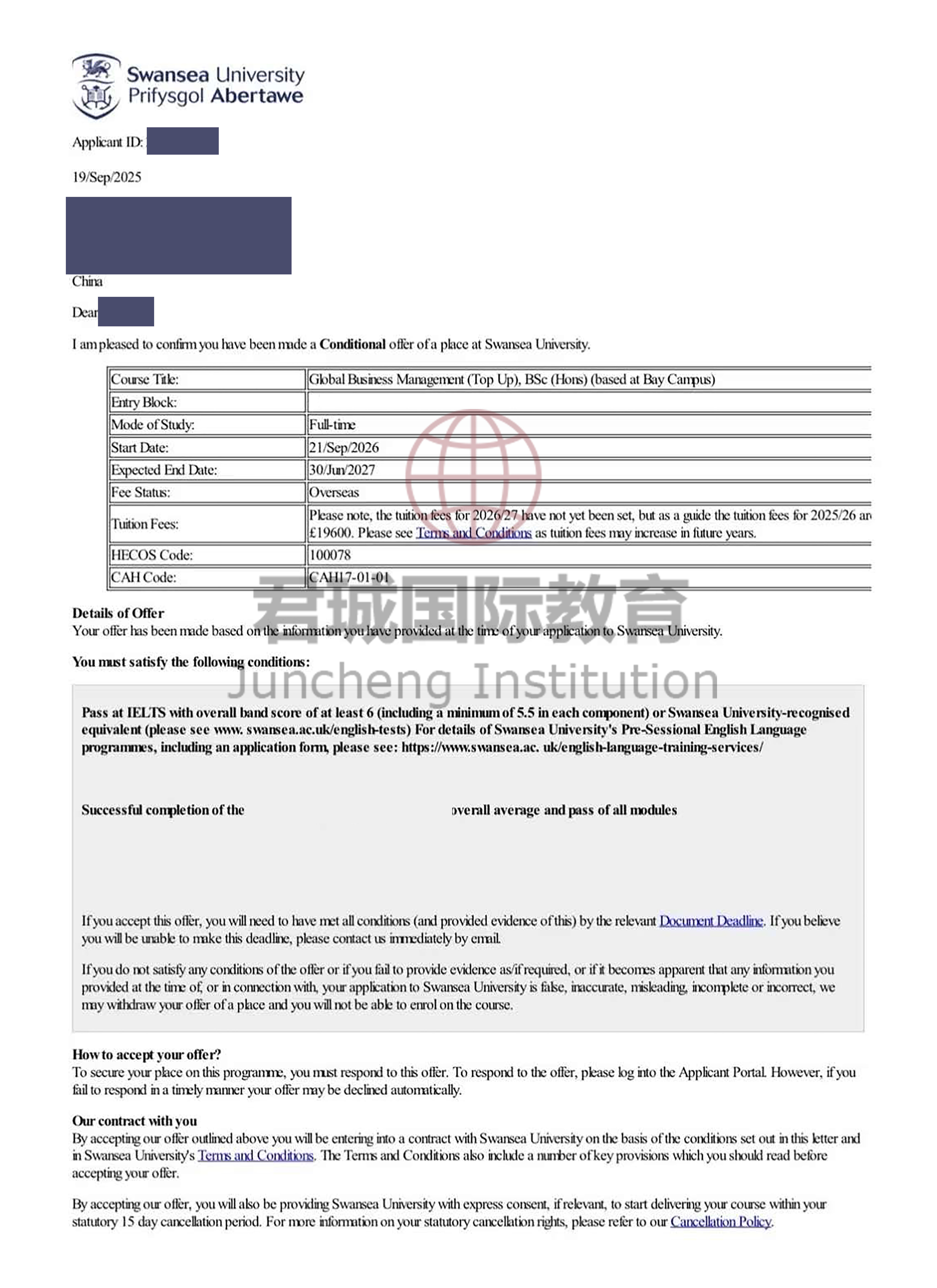 录取Offer:斯旺西大学 Swansea University