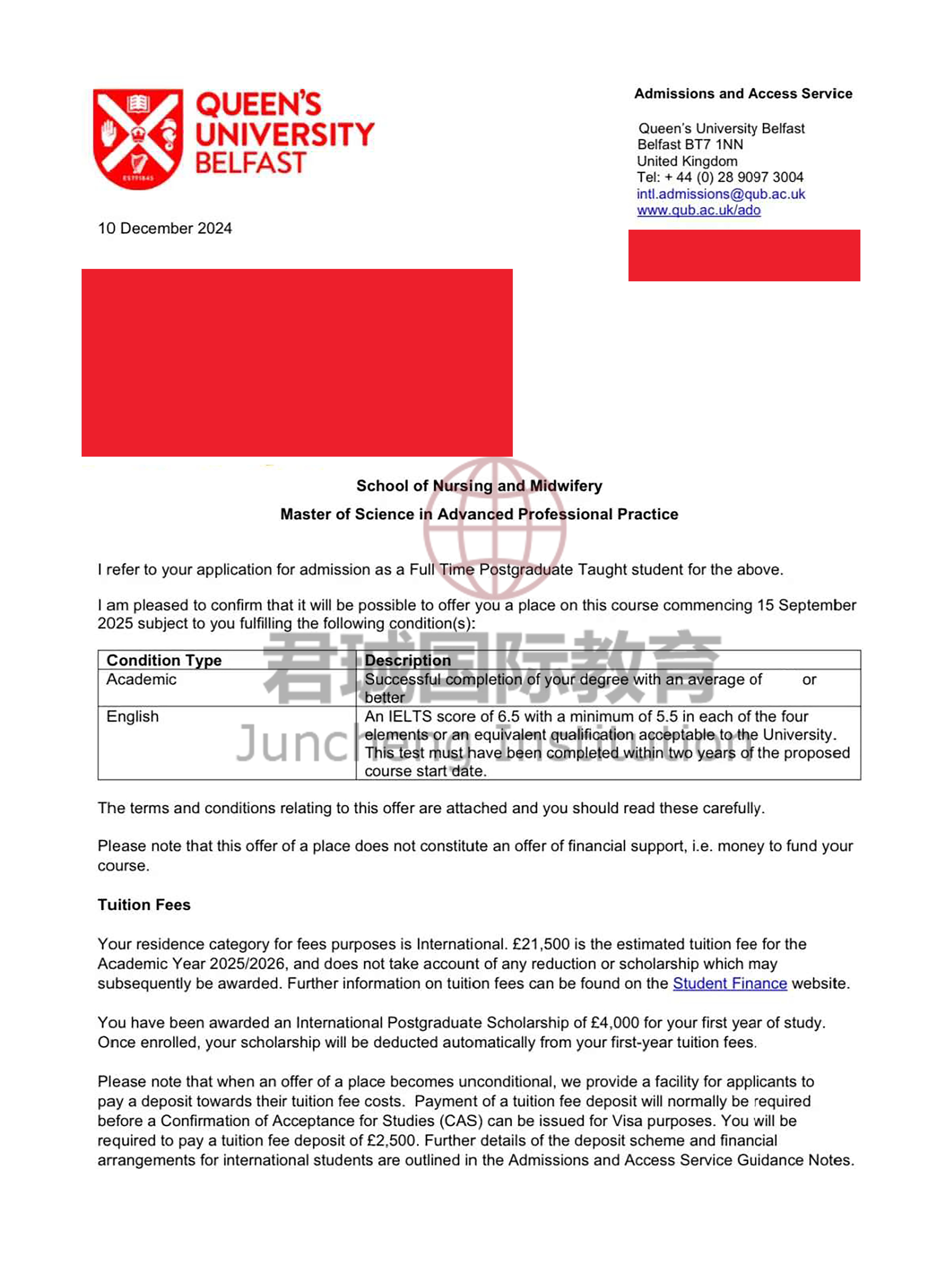 录取Offer:贝尔法斯特女王大学 Queen's University Belfast