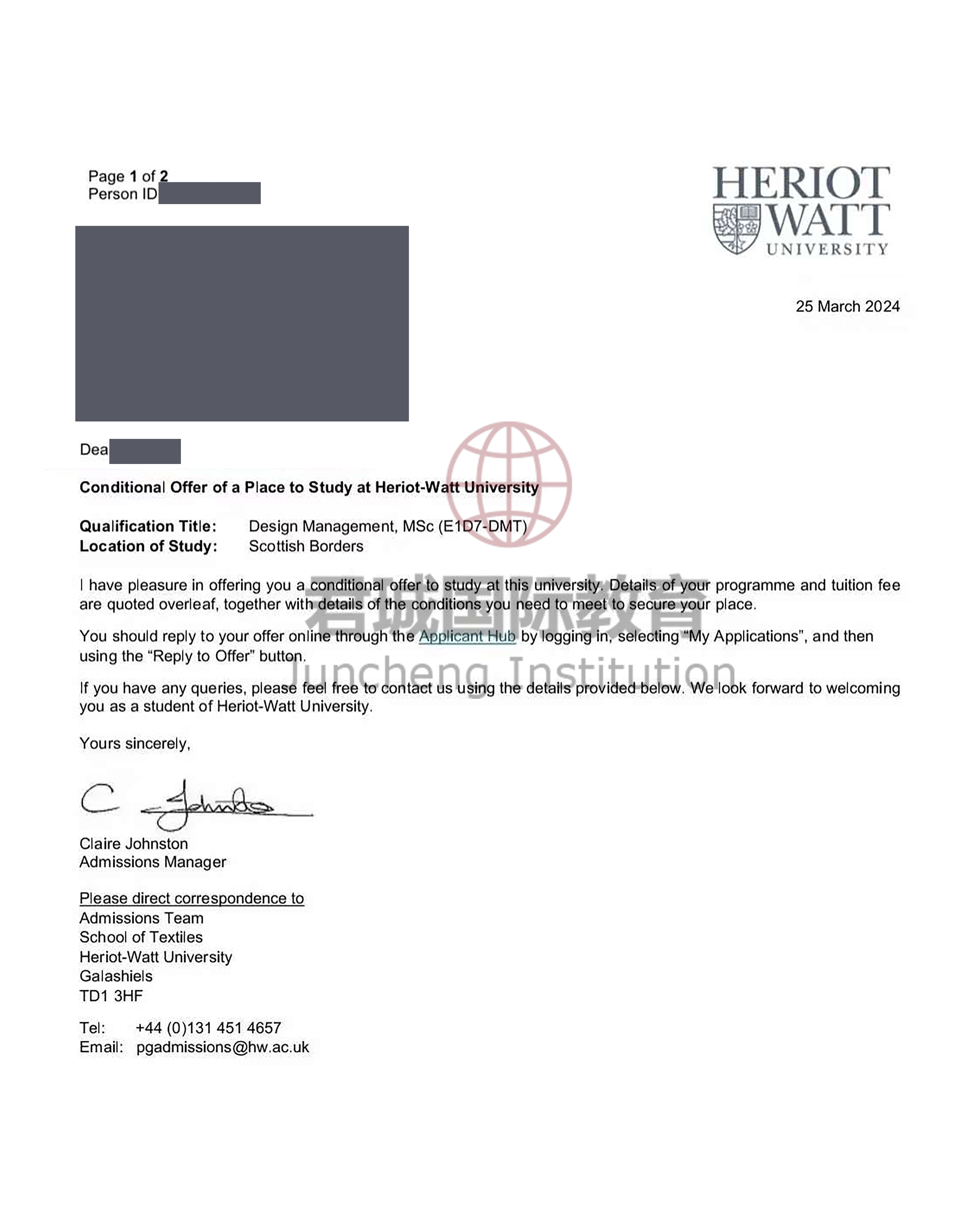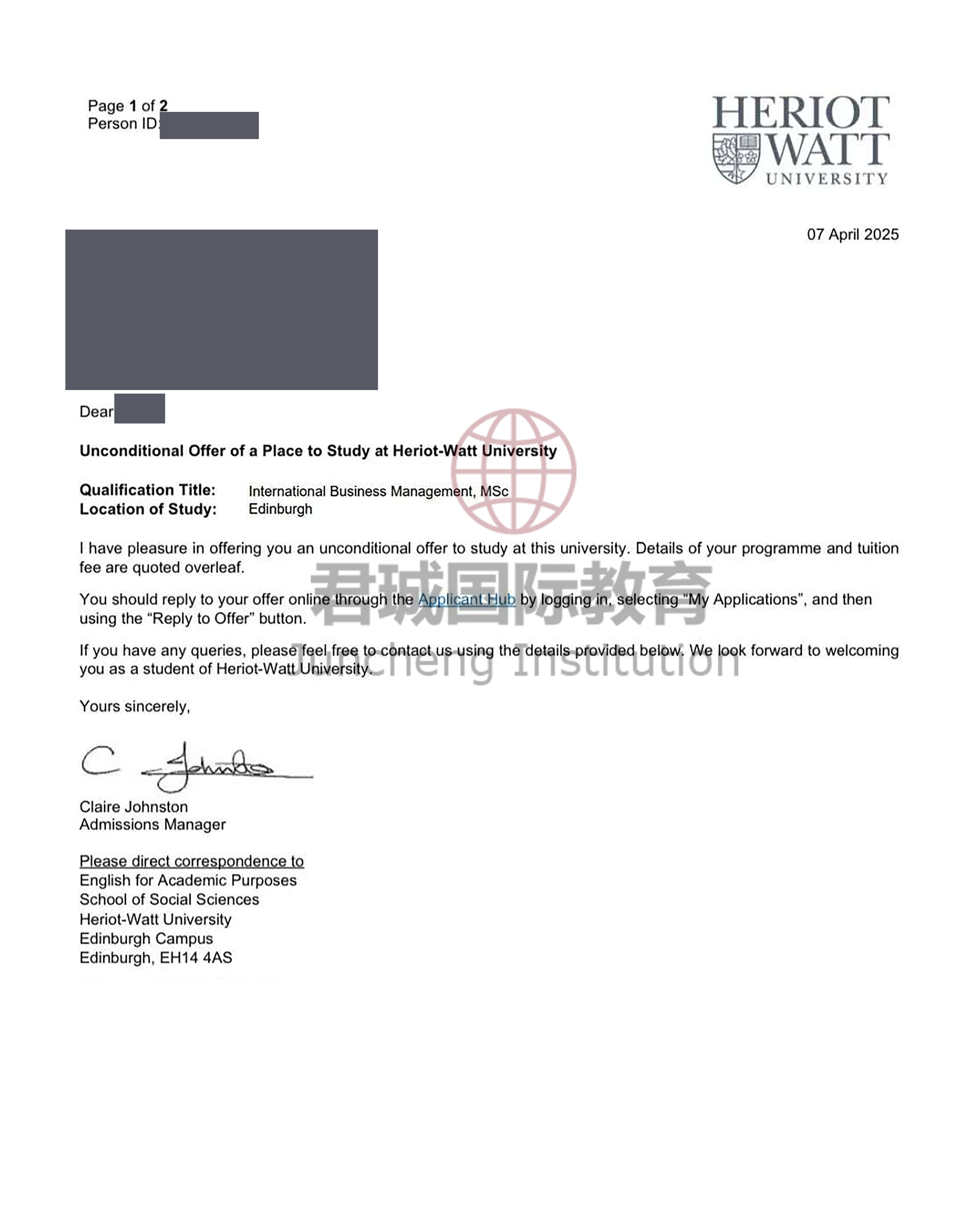 录取Offer:赫瑞瓦特大学 Heriot-Watt University