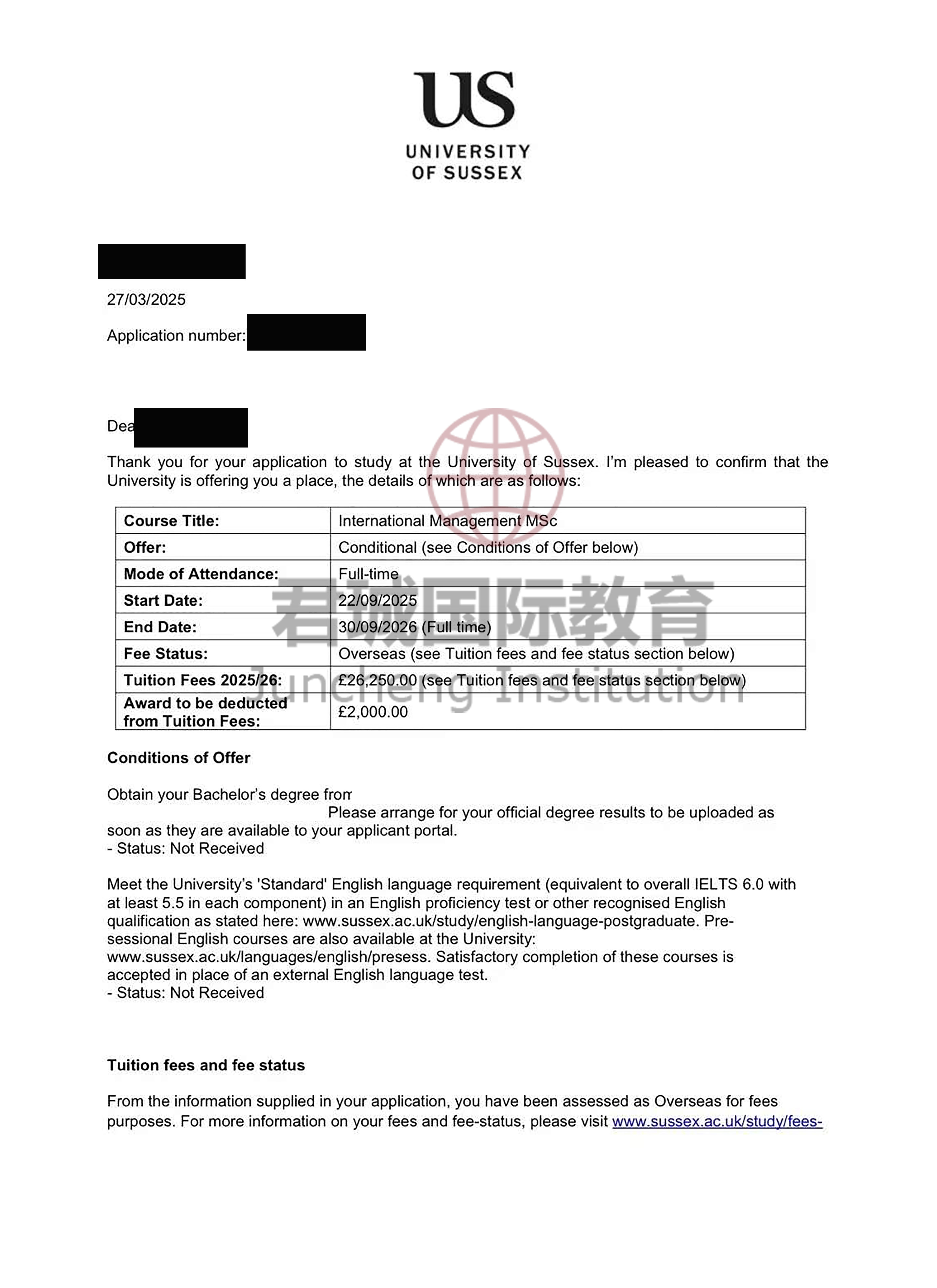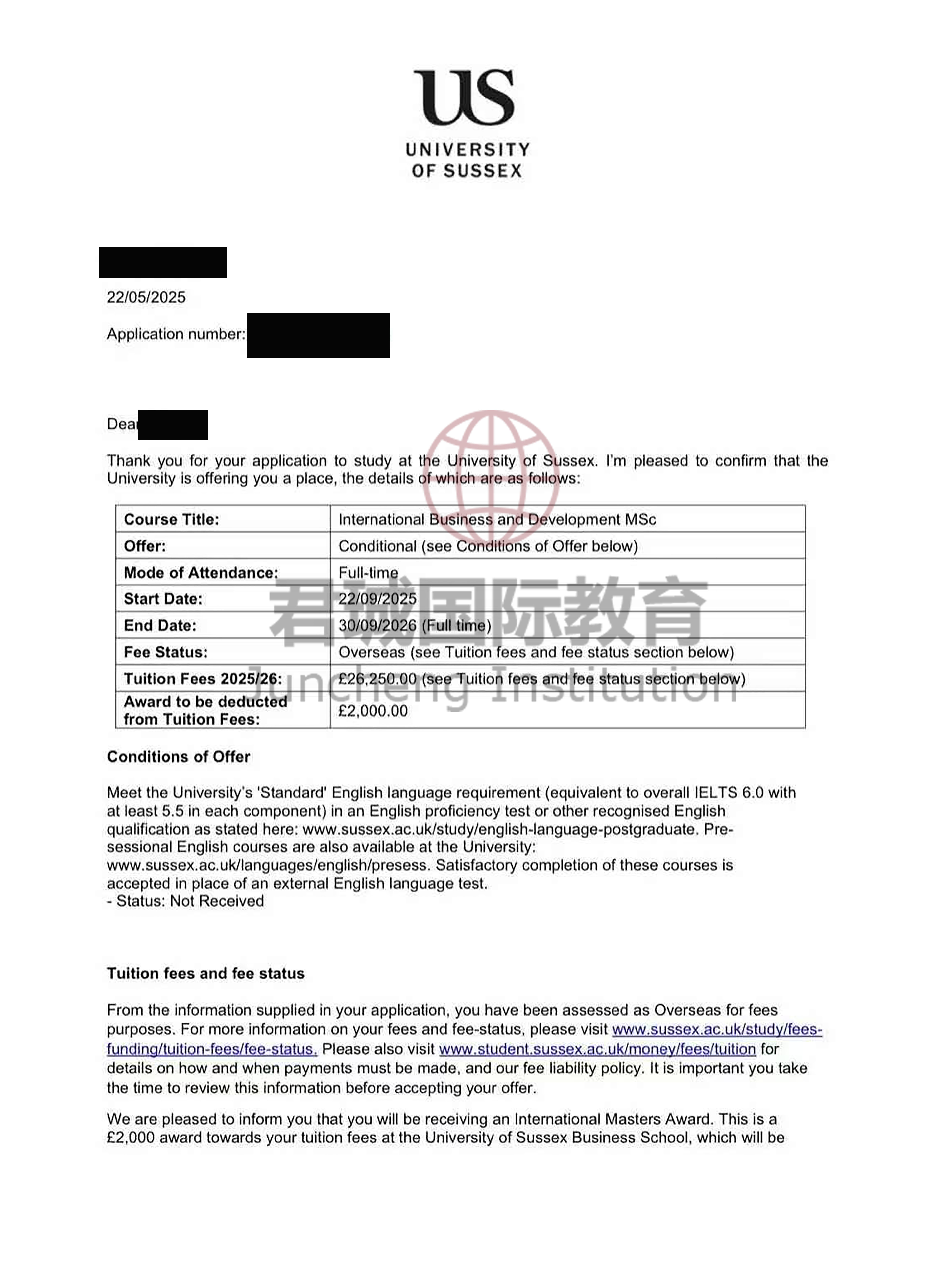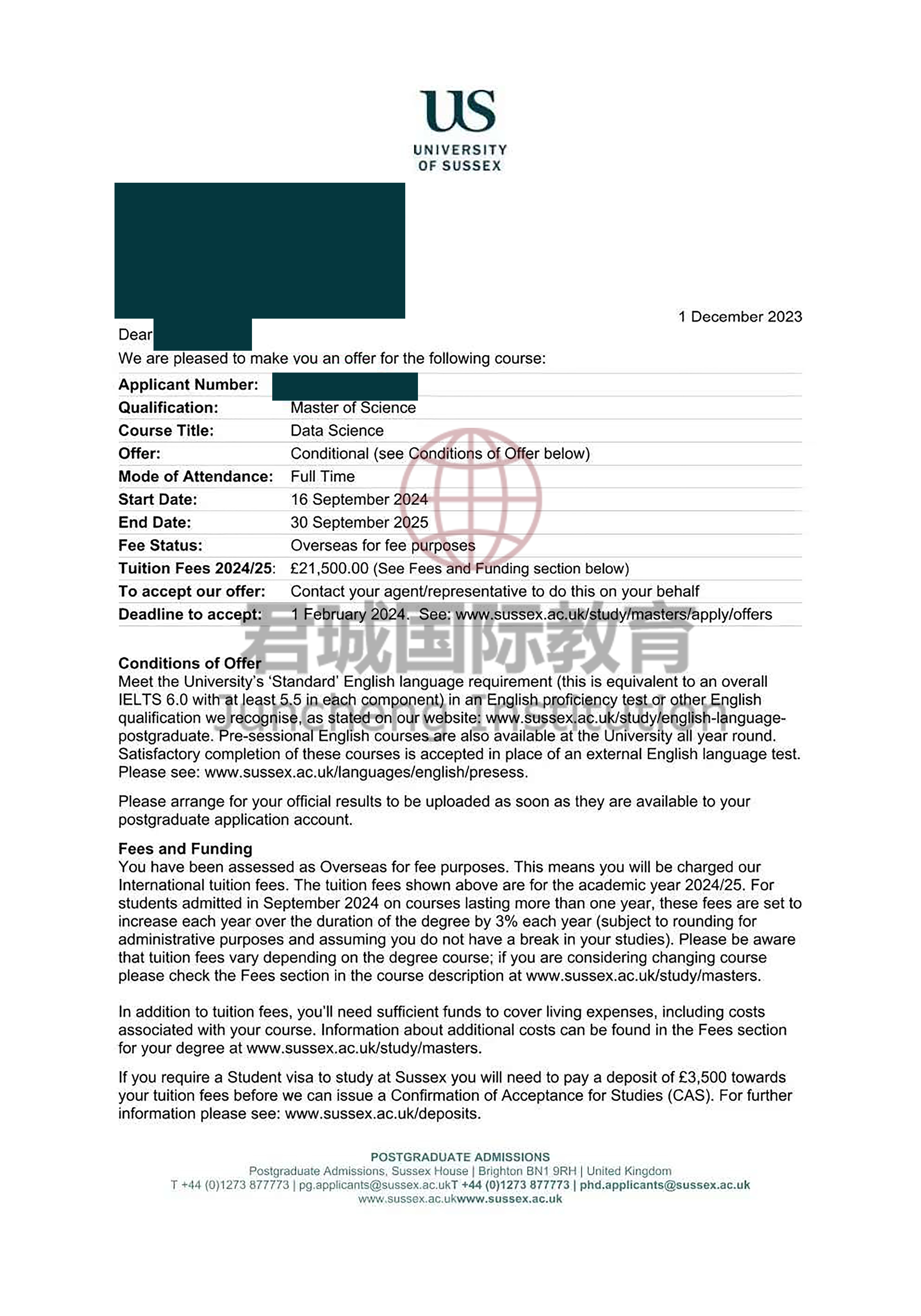录取Offer:苏塞克斯大学 University of Sussex