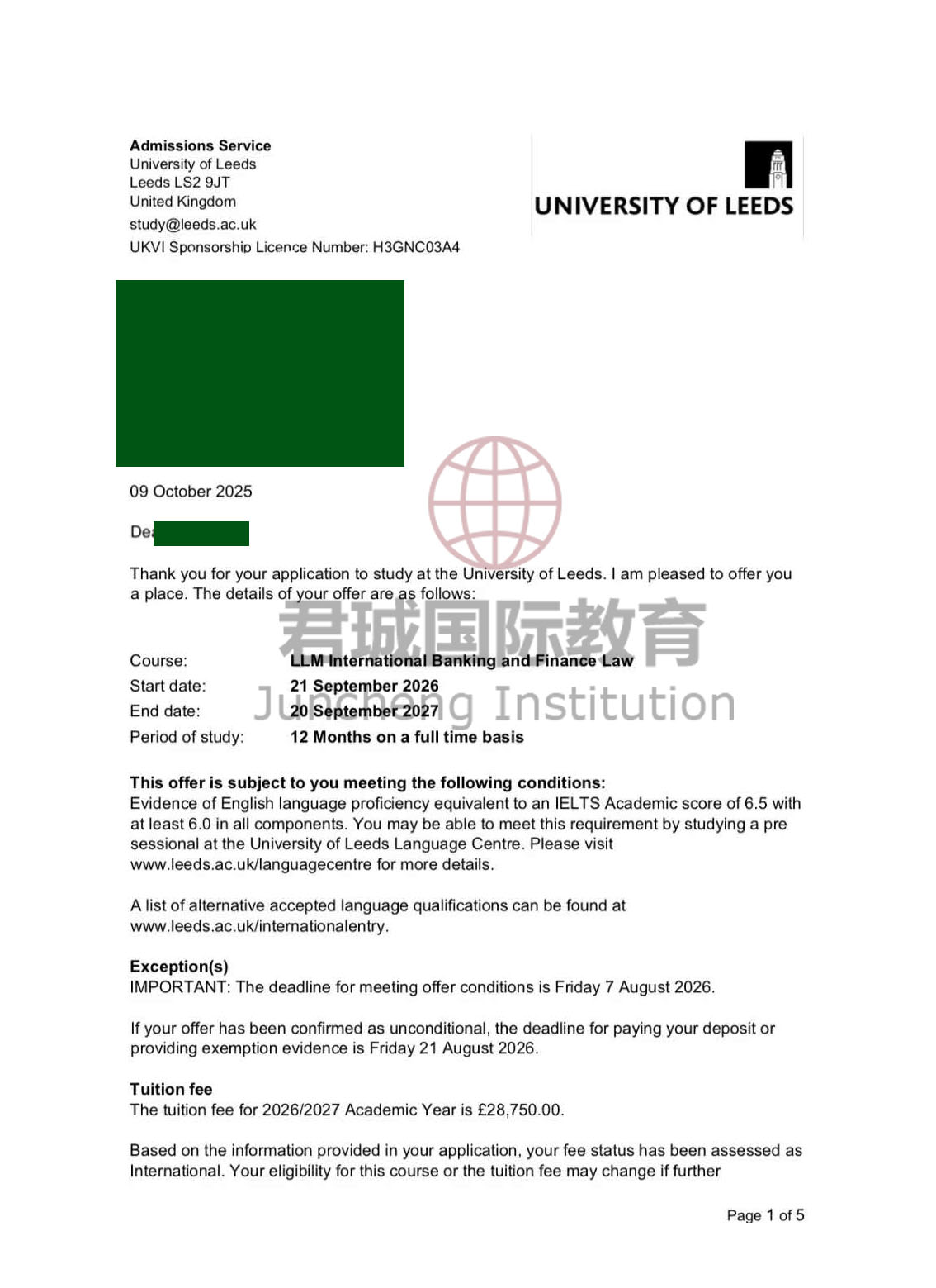录取Offer:英国利兹大学 University of Leeds