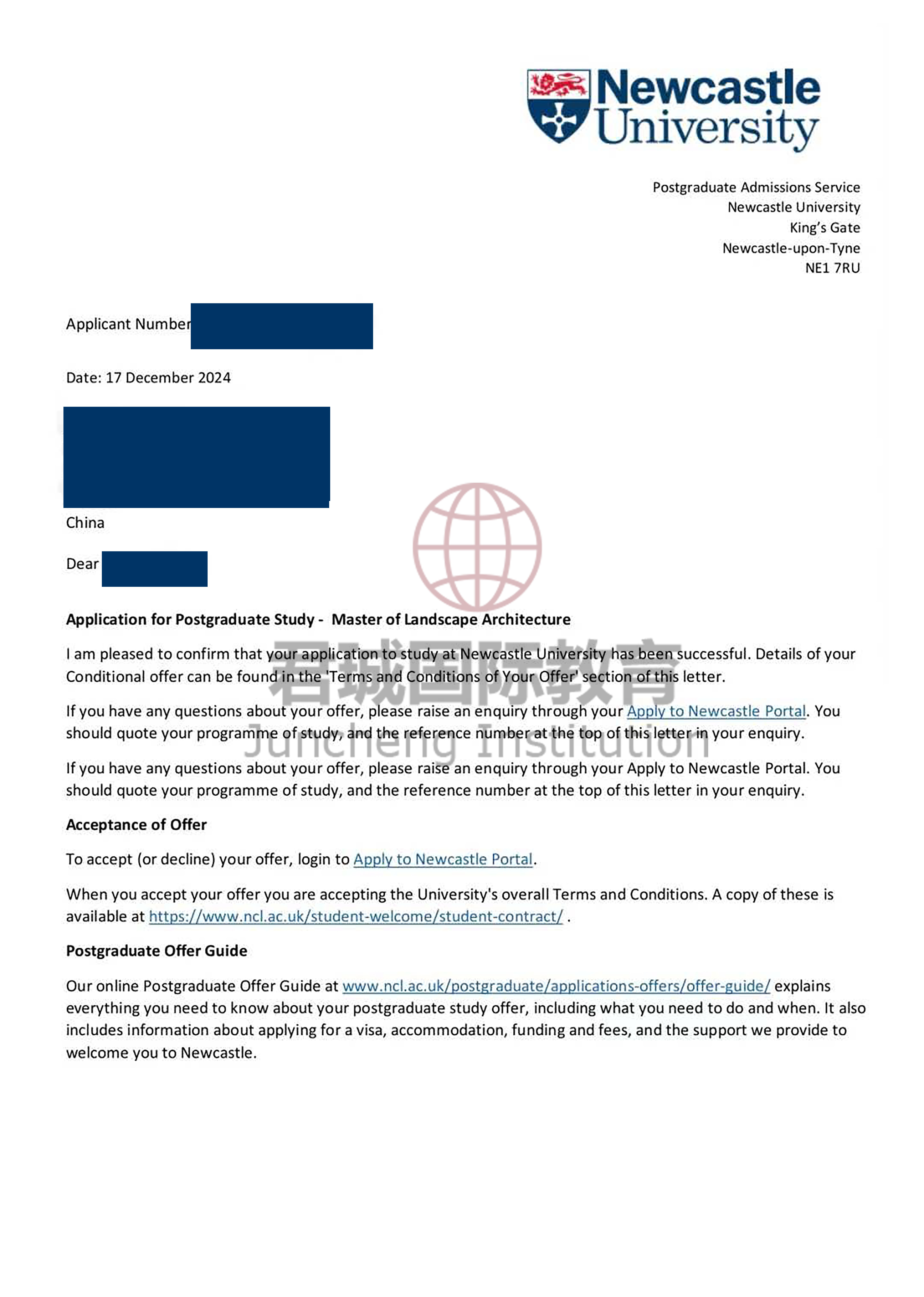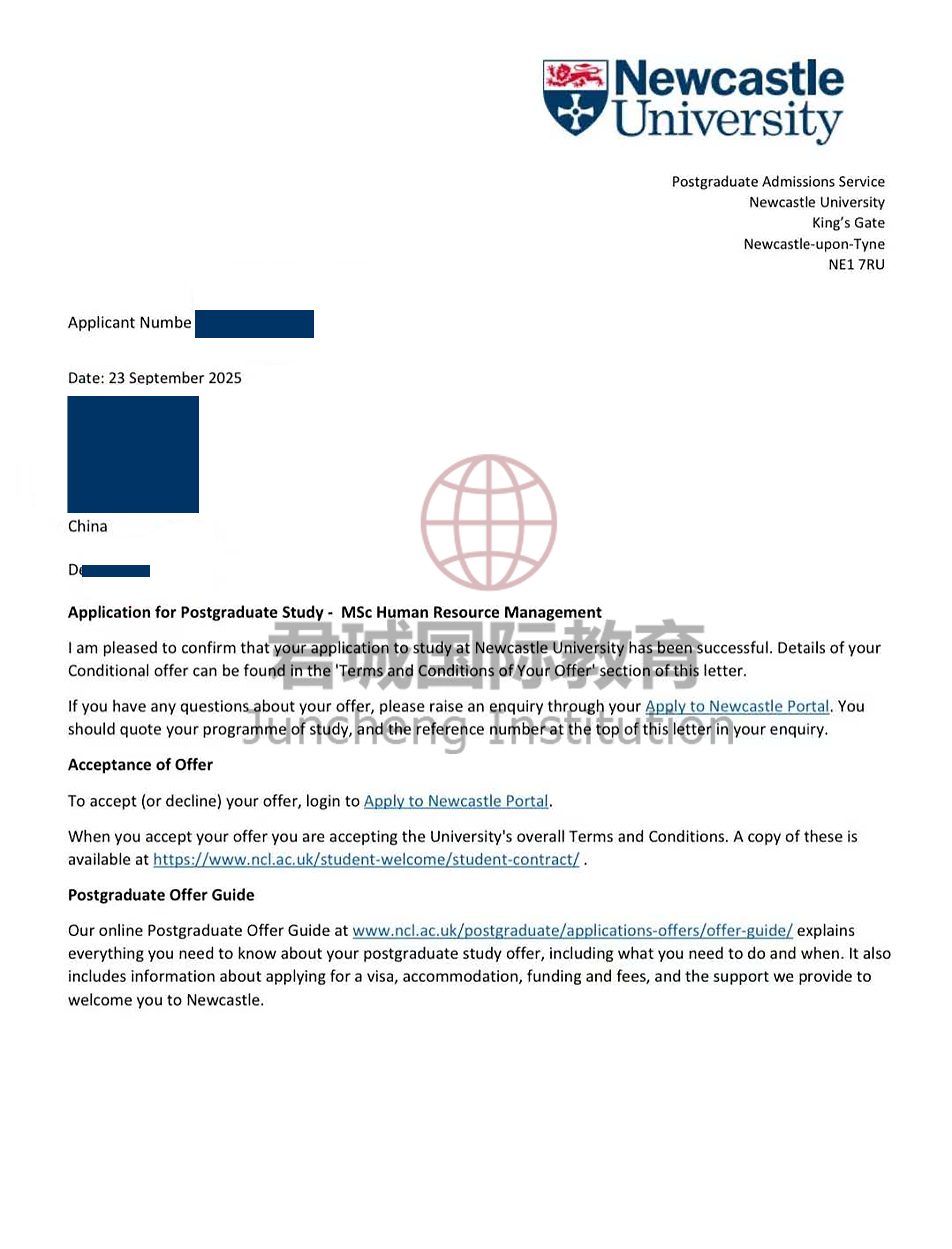 录取Offer:纽卡斯尔大学 Newcastle University