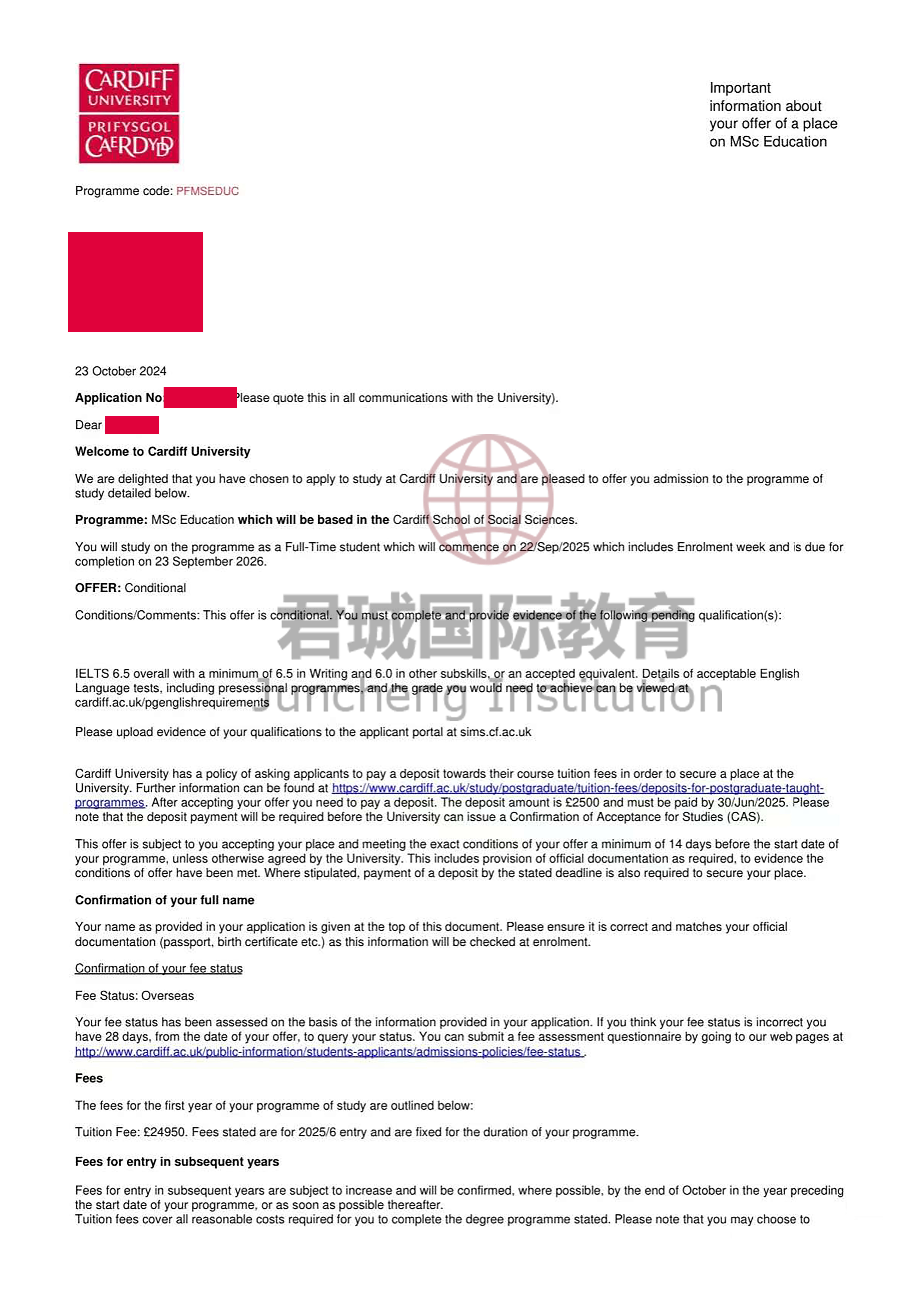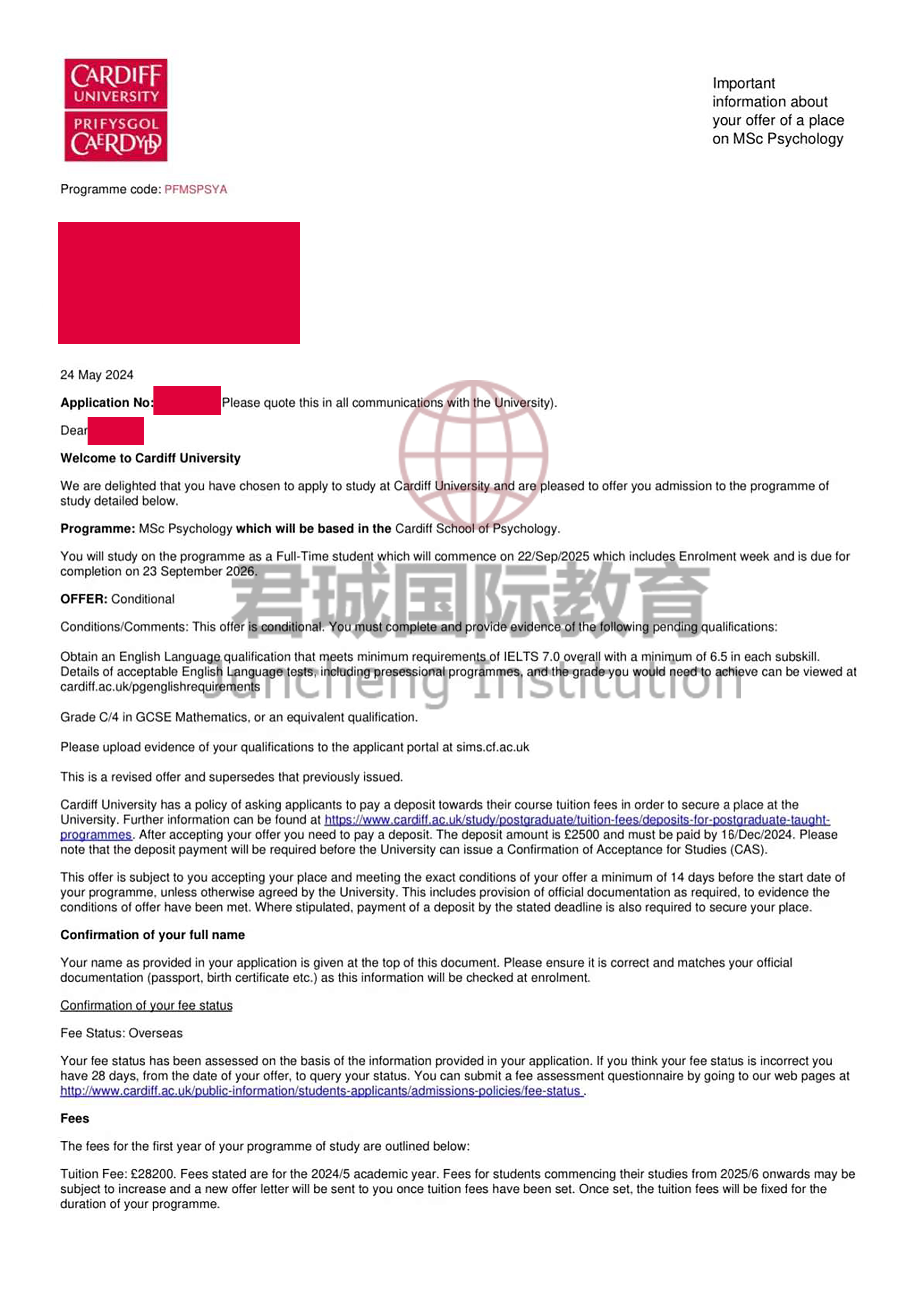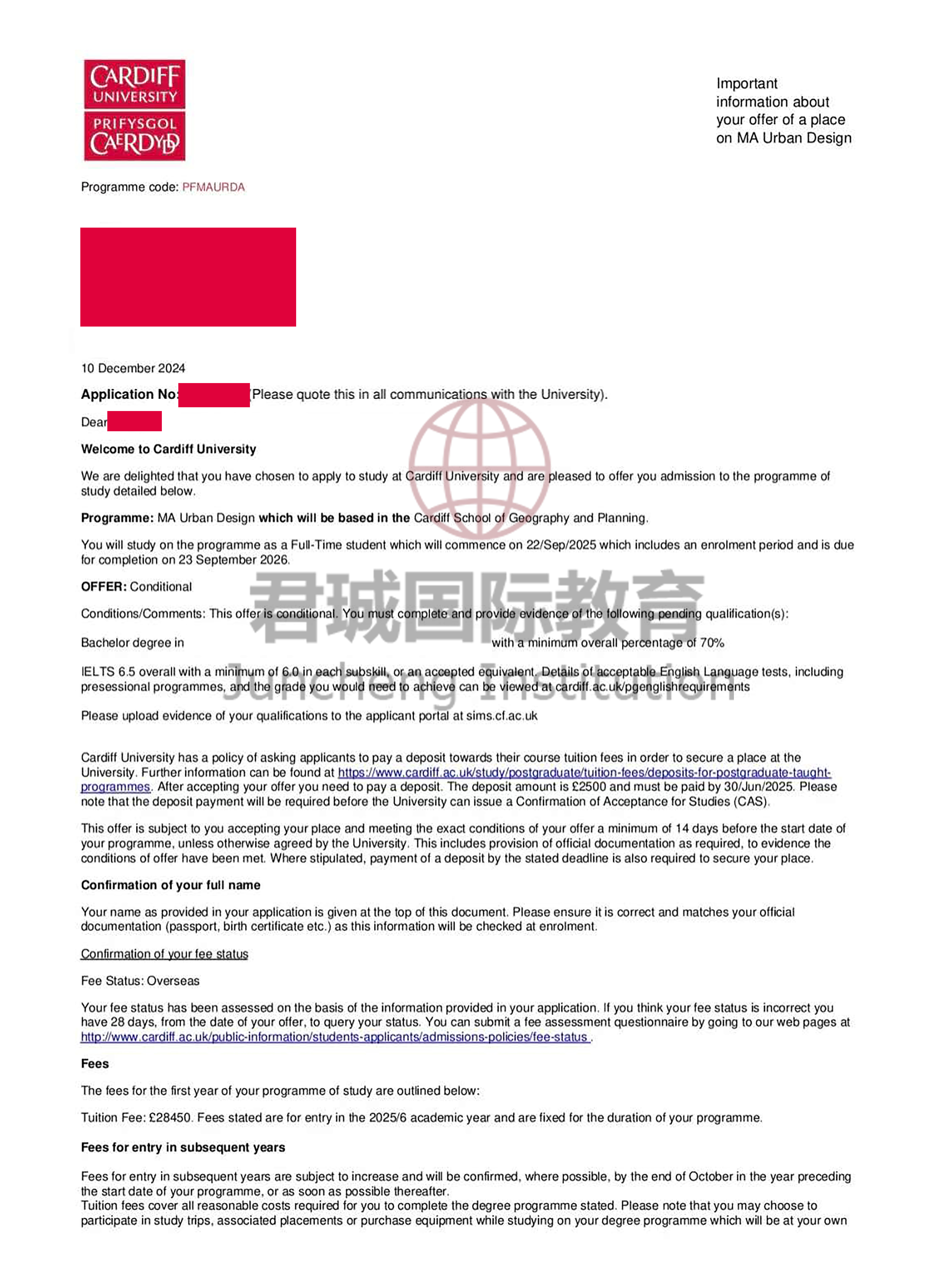 录取Offer:英国卡迪夫大学 Cardiff University